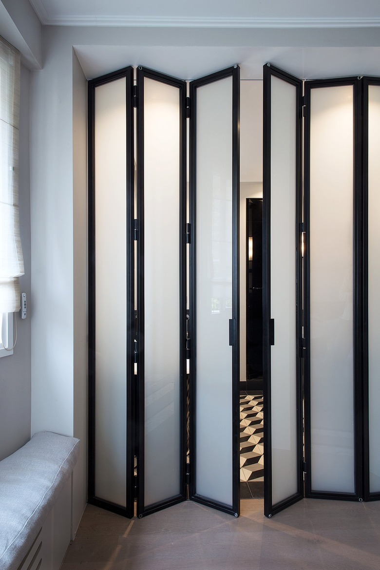 Since accordion doors fold back in sections rather than opening out into the room, they're the perfect solution for small spaces or bedrooms with furniture that would block traditional bedroom closet doors. This black and white design employed by interior designer Marion Deriot features thin fabric panels in the center to keep them from making the room look too dark or heavy.