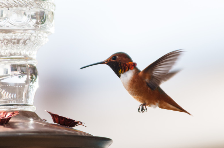 Hummingbirds can flap their wings up to 80 times per second and their hearts beat an astounding 1,260 times a minute, depending upon the species. That much movement requires an extremely high caloric intake, making sweet flower nectar the primary food source for hummingbirds. Though the birds have a varied diet that includes pollen, small insects and tree sap, they rely heavily on nectar and digest it quickly. If you wish to feed hummingbirds in your yard or garden, a sugar water mixture is the best choice.
