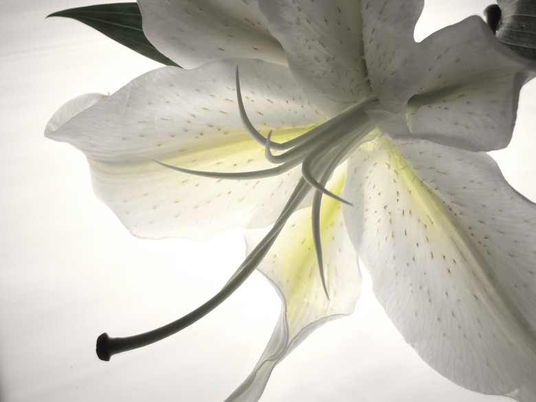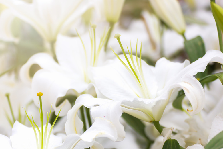 True lilies produce their dramatic flowers on stiff, strong stems that grow from the bulbs. Different varieties have different stalk heights, ranging from 2 feet to 6 feet tall. Once established, they are perennials and return, year after year, during their growing season. You'll find lily cultivars that produce white flowers, along with those that have yellow, pink, orange or maroon. Blossoms can be shaped like trumpets, bowls or bells. Some nod downward, others face outward or turn upward. Many produce a delightful fragrance.