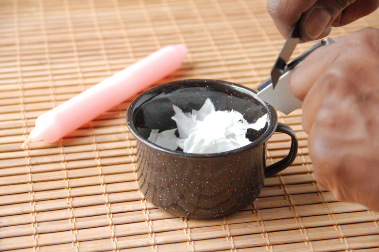 If you're out in the wilderness and you brought only the minimum amount of survival supplies, you hopefully remembered to pack a small piece of flint. Assemble some paper towels or toilet paper into a small pile and rub the flint against anything made of iron, such as an ax blade or a non-galvanized metal tent stake. Rub the flint vigorously in the direction of the paper; the action releases shards of iron that instantly turn into sparks and should eventually ignite the paper. Once the paper is burning, use it to light your candle.