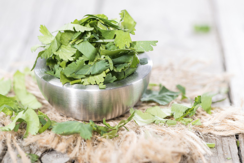 Put your thirstiest herbs together in the same pot, mixing colors and textures. Combine one "thriller plant" — an impressive upright plant that appreciates damp soil, like parsley (Petroselinum spp.) or basil (Ocimum basilicum) — to catch the eye. Add leafy French tarragon (Artemisia dracunculus var. sativa) as a filler, and chives (Allium schoenoprasum) to droop over the edges of the pot. French tarragon is hardy in U.S. Department of Agriculture plant hardiness zones 2 through 9, while chives thrive in zones 4 through 8.