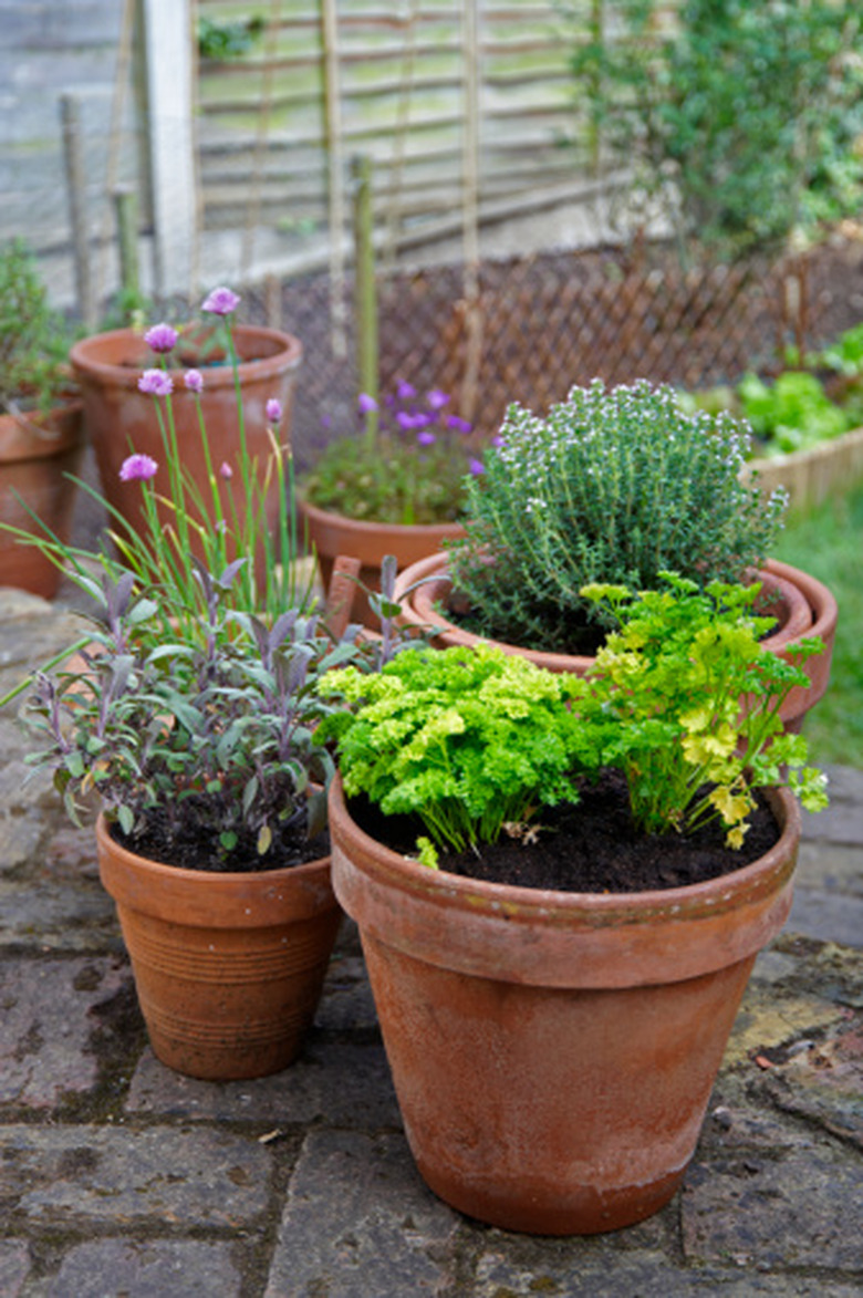 Sage (Salvia spp., zones 5 – 10), rosemary (Rosmarinus officinalus, zones 8 – 10) and thyme (Thymus spp., zones 2 – 10) grow happily together. Unlike parsley, all three prefer less water and soil that's kept on the dry side. Plant them in an unglazed terra-cotta pot that absorbs water. Add a tall "Mediterranean" herb like lavender (Lavandula angustifolia, zones 5 – 9) or dill (Anethum graveolens, annual). Add oregano (Origanum vulgare, zones 4 – 9) to provide the side frills.