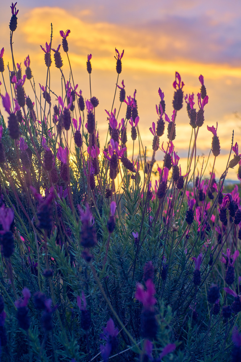 Spanish lavender (Lavandula stoechas) is sometimes called French lavender (although this common name denotes another species) or butterfly lavender. The shrub is aptly described as "tufted" lavender, with upright petals at the top of the flower heads and full, thick flower spikes. They are much less hardy than English lavender, thriving in USDA zones 8 and 9, although some selections are hardy to zone 7. They flower in late spring in warm zones, their early blooms followed by a second flush that flowers into autumn.