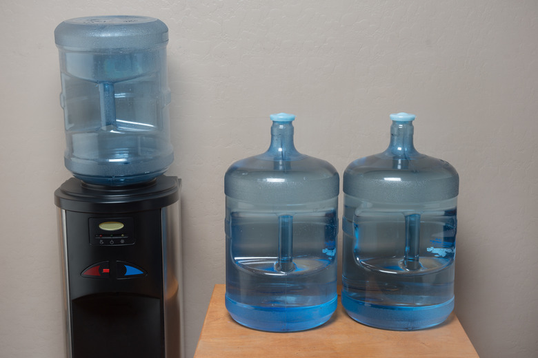 Standing with your feet shoulder-width apart, bend down in front of the replacement water bottle. Get into a comfortable position and place one foot slightly in front of the other for leverage. Use your dominant hand to securely grasp the bottle's neck, and place your opposite hand under the bottle. Slowly stand up, keeping your back straight and lifting from your knees. Set the bottle down on the chair next to the cooler and remove either the cap or the tab from around the neck, depending on the type of bottle you have. Lift the bottle up and slowly tip it to a 45-degree angle to allow water to begin dripping into the cooler. Place the bottle into an upright position as the flow of water into the cooler begins to increase, and then secure it onto the base.