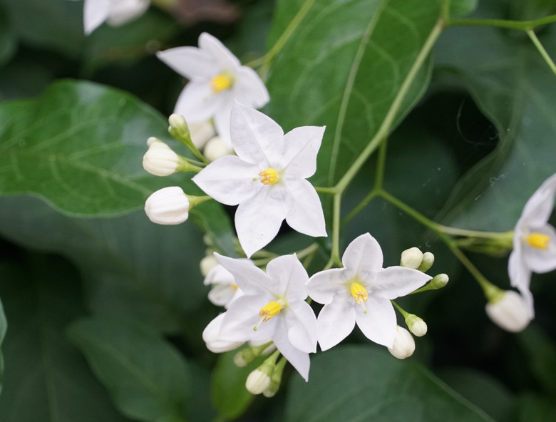 The poor potato vine plant (Solanum laxum, USDA zones 8-10) ought to sue the person who saddled it with its misnomer. Despite most people's assumptions, this isn't a plant children grow by sprouting a potato's eyes. Not to be confused with the ornamental sweet potato vine (Ipomoea batatas, zones 9-11), which is prized for its foliage, potato vine boasts a profusion of showy star-shaped white blossoms that adorn vines up to 25 feet long. The potato vine plant is a decorative climber of walls or fences and ideal for a special spot in your garden, covering a lattice.