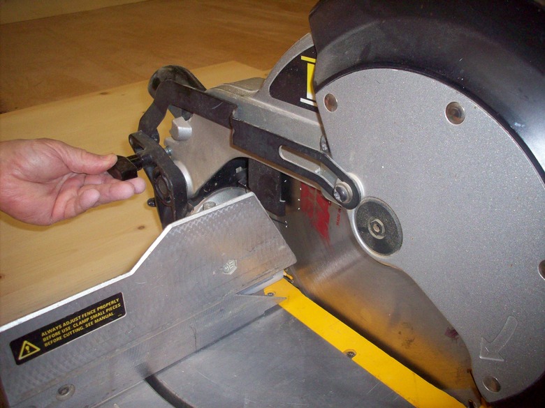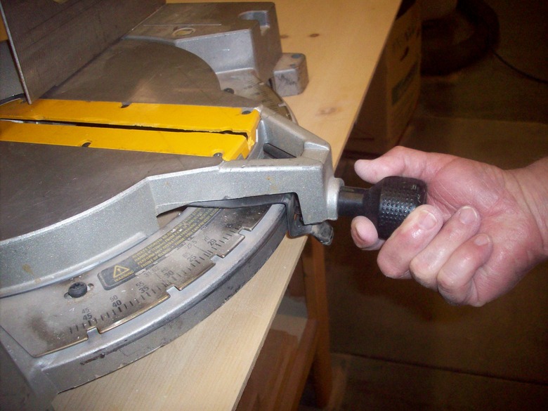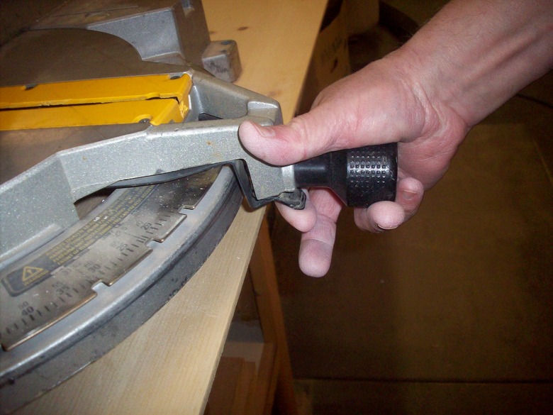 Two locks on the front of the saw control the angles. The large, horizontal knurled knob locks the left-to-right swivel action of the blade. The lever underneath the knob locks and releases presets for common angles. Depending on the model, some manufacturers place the lever on top of the knob; it works the same way. Other models may or may not have locking controls on the front, such as some models of compound miter saws.