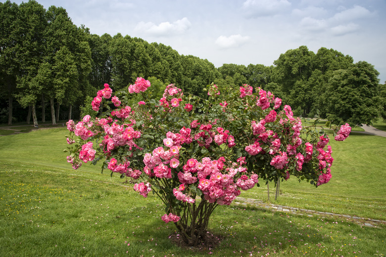 Rose bushes are shrubs that feature roses. They're popular because they not only come in various colors, but many have a long bloom period between early spring until late fall, with some types blooming only once. Although the flowers on rose bushes can come in various colors, the most popular shades are white, pink and red. When shopping for rose bushes, make sure that you don't confuse them with other varieties of plants.
