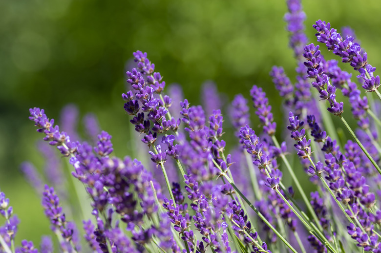 One of the most widely grown lavender species, Lavandula angustifolia, also known as English lavender, is an aromatic subshrub that comes from the Mediterranean. The semi-woody plant is a perennial in U.S. Department of Agriculture plant hardiness zones 5 through 8, grows to 1 1/2 to 3 feet tall and has narrow, green leaves on square stems. During the late spring to early summer, aromatic blue-violet, mauve, pink or white flowers can grow in terminal spikes. In warm winter climates, the leaves are evergreen. Lavender loves full sun, but it also likes afternoon shade in hot climates. Although lavender is very drought resistant, the woody subshrub will flower better if the doesn't dry out completely.
