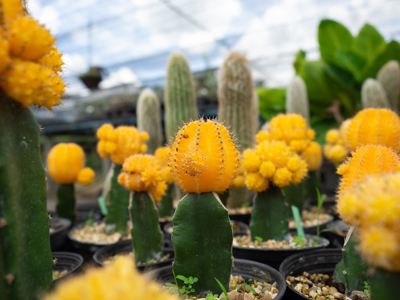 They say teamwork makes the dream work, and that's particularly true when it comes to the moon cactus (Gymnocalycium mihanovichii, U.S. Department of Agriculture plant hardiness zone 10). Horticulturists believe that these beautiful cactus plants, known for their colorfully flowered tops, stem from a 1940 mutation that lethally damaged the plants. The mutated plants showed brilliant red and yellow flowers, but were unable to produce the chlorophyll needed for photosynthesis.
