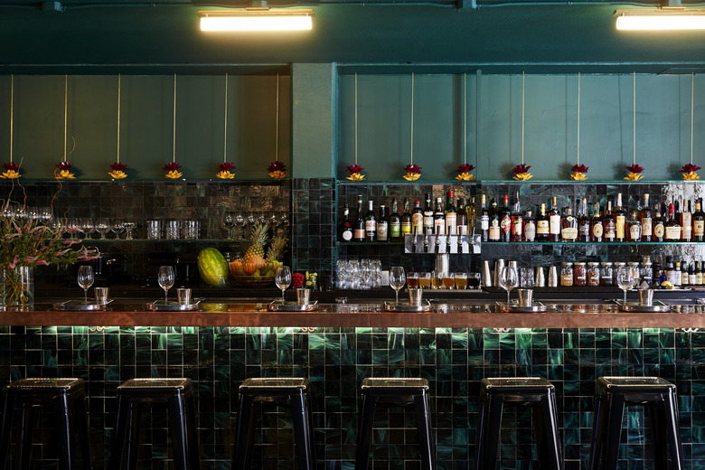 Singh's favorite aspect of Babu Ji is the bar: "I wanted the bar to feel really special, like a jewel," she said. The metal-and-brass floral installation that hangs above the shelves was curated by local artist Jenni Witt, and nods to the floral garlands that Indians adorn themselves in for special occasions.