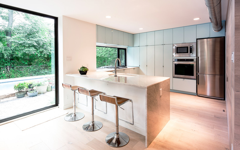 White-washed oak from Landers Premier Flooring complements an abundance of light from the sliding doors. Cabinets by UB Kitchens in a muted green add to the airy feel.