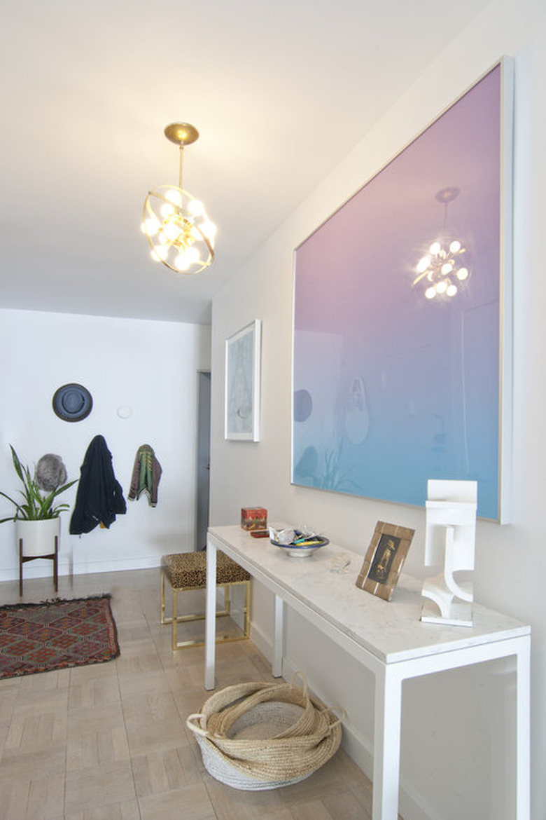 A light that was left by the original owners was repurposed over the entryway. Calico wallpaper was made into art by adding a frame, and a custom-made table from Room and Board completes the look.
