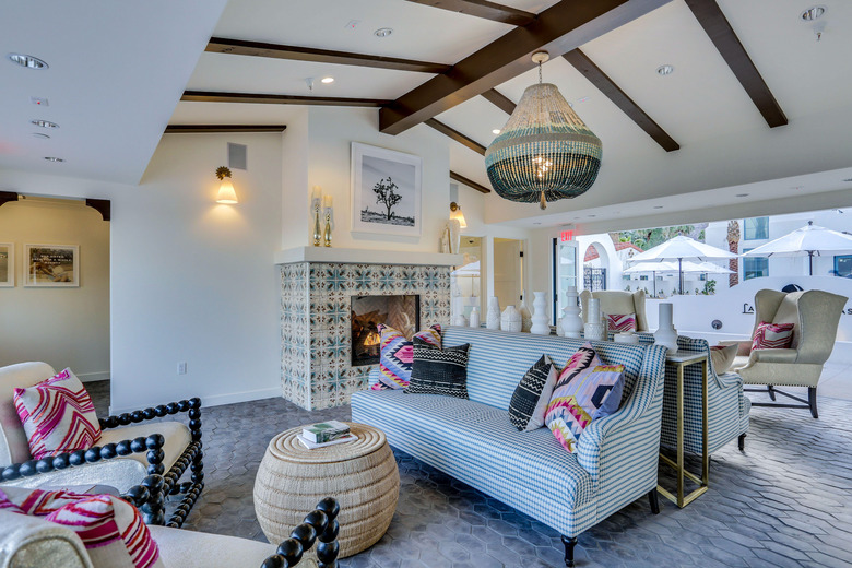 With one wall open to the pool, the lobby features blue-and-white love seats and textile pillows next to a tiled fireplace.