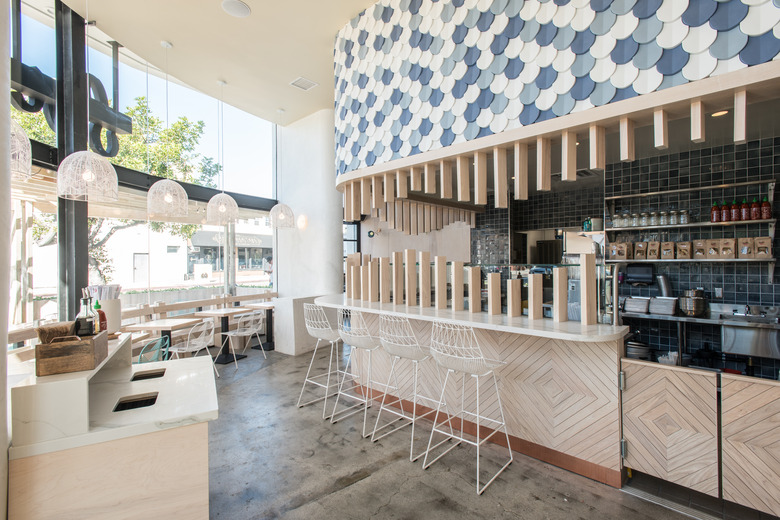 When co-founder Brett Nestadt set out to design the fifth location of Sweetfin, a popular Los Angeles poké restaurant, he knew that spending time on creating a cohesive atmosphere was as important as developing a tasty menu. He wanted to interpret Scandinavian and Japanese influences for a casual California setting, which is confined to a small dining space on a well-trafficked city street. The result not only satisfies his objectives, but is a smart example of how to maximize the impact of a minimalist design. For starters, the dining area is centered around a focal point of brightly-colored tiles, and the adjoining materials — like light-colored wood against white seating and fixtures — place the attention on this eye-catching subject. Then, the layout of the furnishings complements the structure of the space itself, curving right alongside its frame. And in keeping with a paired-down aesthetic, the intrigue is in the details: geometric lines throughout the locale provide just enough interplay with the rest of the decor. Its a look that's definitely hip, but approachable enough for everyday meals.