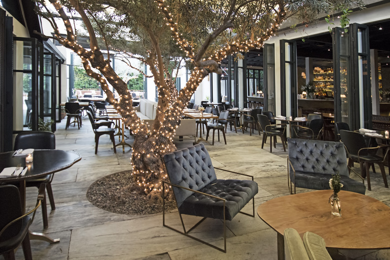 Lights wrapped around the olive trees blur the lines between dining room and garden in the best ways, and play up the details of its Mediterranean inspiration. The mixed seating options fit in seamlessly with the garden atmosphere.