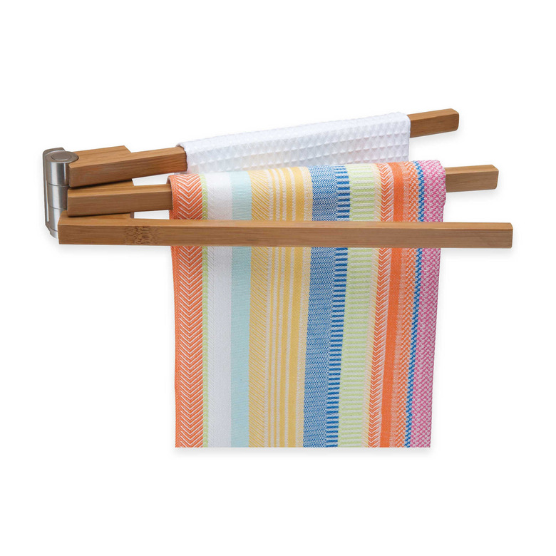 Hang up dish towels and aprons where you can easily reach them without damaging your pristine walls with multiple nails and hooks. This towel bar from Bed Bath and Beyond ( $24.99 ) has three arms that will keep those items nearby and out of the way.