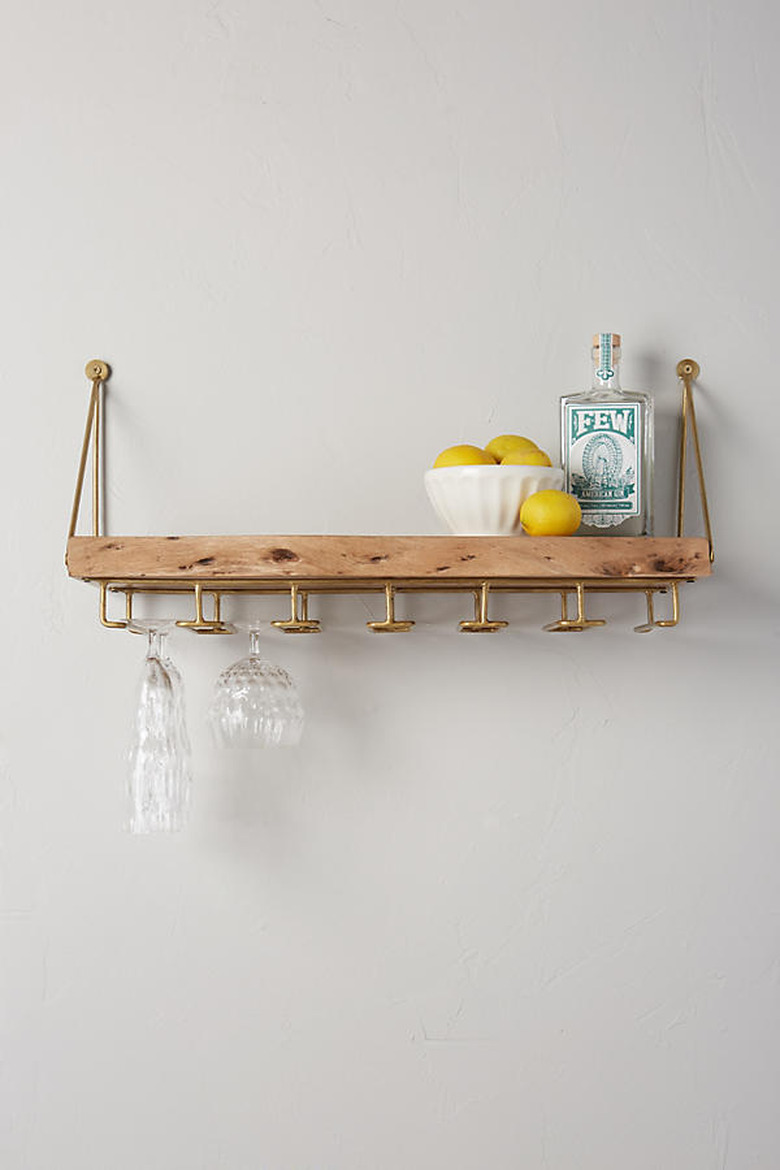 The best way to get clutter off your counter for good is to give everything a proper home. This live-edge bar shelf from Anthropologie ( $178 ) will house your stemware on the lower half and other garnishes on top. Add things like a bowl of bright citrus or a bottle of spirits to make your new bar double as decor.