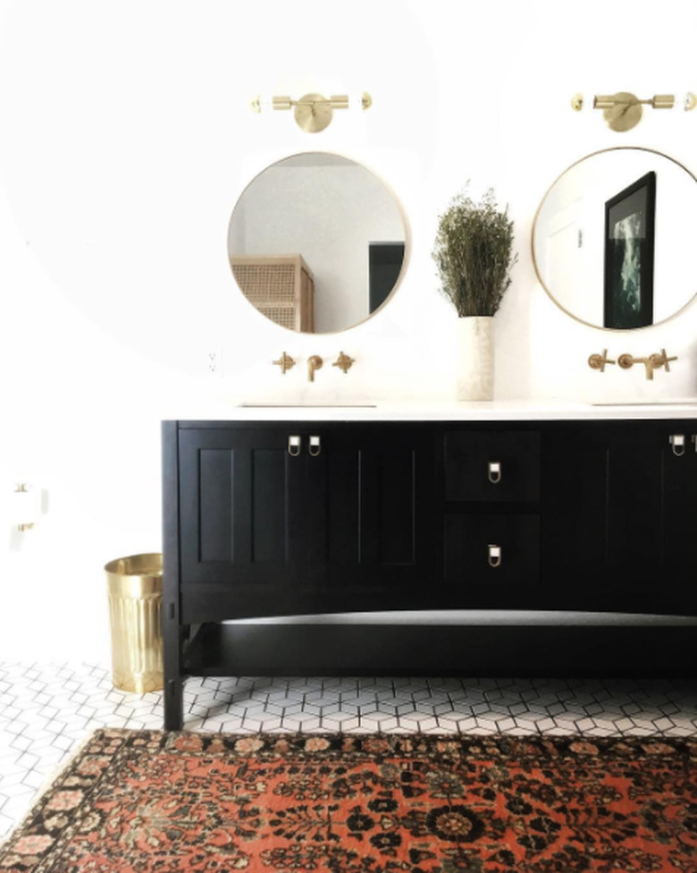 Just when we thought we couldn't possibly swoon over this year's black bathroom trend more, we stumbled upon this stunner by Whitney Utesch of Carpendaughter. Once again, the room's brilliance comes down to balance. A black accent wall keeps from appearing too heavy thanks to a base of white subway tiles — yet another longstanding trend — and a natural wood counter beneath the sink adds a dose of warmth to the stark contrast of those opposing hues. Meanwhile, a big ol' round mirror further softens the inky hue's hard edge, while a bare industrial bulb plays up its cool factor. Brushed metal hooks polish off the look with just the right amount of glam, but you know it's that black faucet with its oh-so-chic appearance that's giving us all the design feels. Despite its simplicity, it gives the unique impression that no other fixture would do.