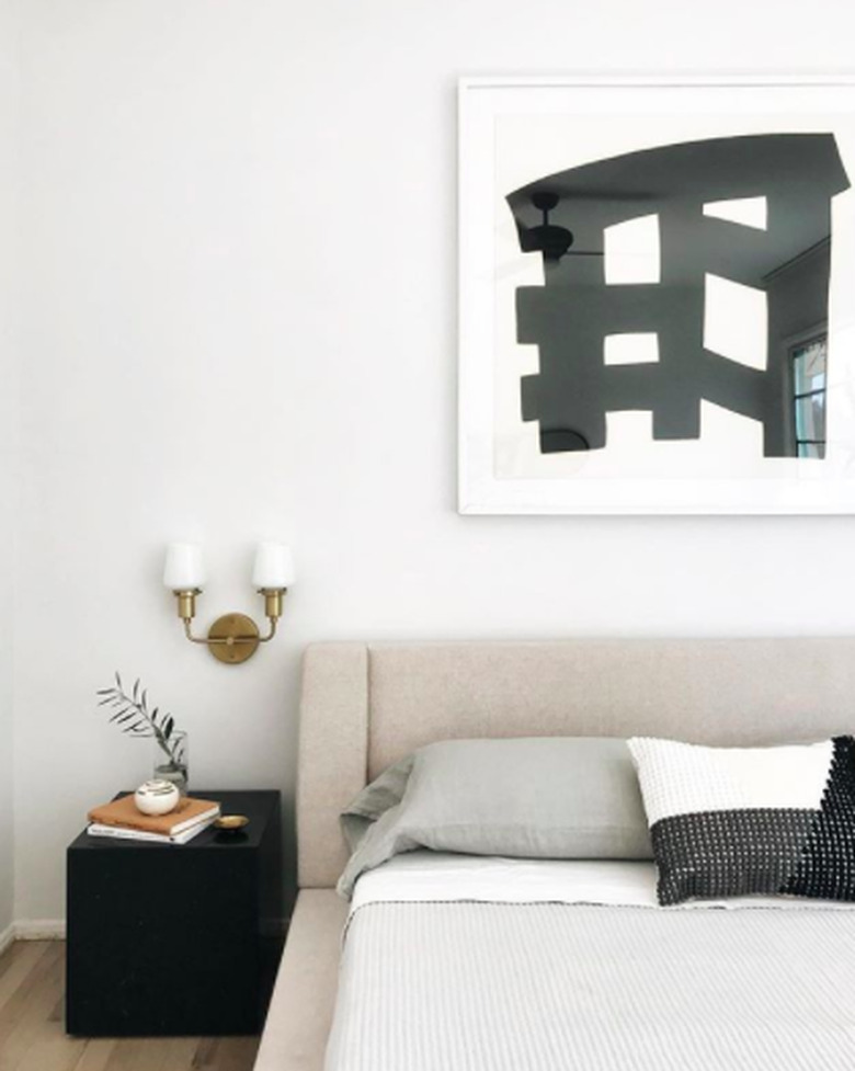 This beautiful bedroom gives us every indication that it was outfitted by a pro, which is no surprise when you consider that it was styled by one of our favorite designers, Ginny MacDonald. She flawlessly mixes compelling patterns and simple shapes in this space for a balanced look that's rich in layers but still perfectly mellow. It all starts with the focal point of the room, the bed, which is covered in shades of blue to give the atmosphere an appropriately soothing feel. A gray brushed-metal side table and matching rug ground that look with their complementary tones, while simple black frames around white artwork draw the linens' minimalist qualities up to the wall. And yes, of course, that bold black-and-white wallpaper is an unexpected choice that takes this design to the next level. Its intricate details balance out the surrounding simple furnishings, and give a fresh spin to an otherwise muted palette.