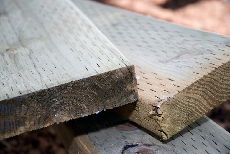 Pressure treated wood has been around since the 1940s. For many years, manufacturers produced it by infusing chromated copper arsenate (CCA) deep into the grain under pressure. This compound contains arsenic, so you definitely don't want it anywhere near the curious mouths and fingers of toddlers. However, the industry stopped using CCA, which gives the wood a deep-greenish color, in 2003. Today, the chemicals you find in pressure treated wood are generally more benign. They include ACQ (Alkaline Copper Quaternary), Sodium Borate (SBX) and Micronized Copper Quaternary (MCQ). These compounds also stain the wood but not as much as CCA did, and the color is usually closer to that of natural wood.