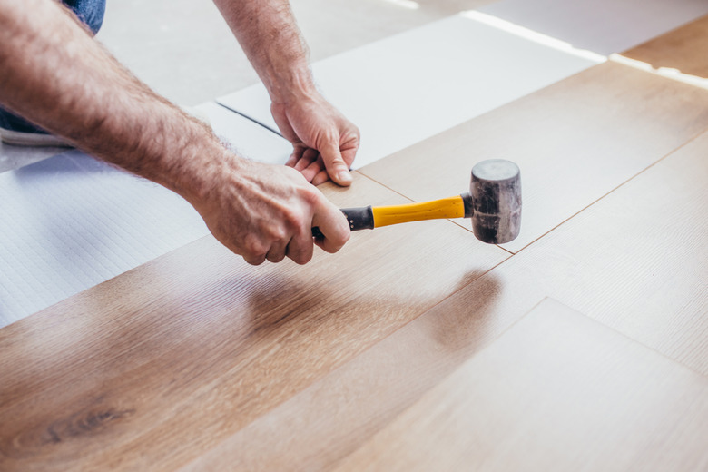 You can use the same technique to cut notches around floor registers that run parallel to the board direction, but laminate flooring planks are wider than most registers, so it's possible you'll have to cut a hole in a single plank. Because you can't trace the hole on the bottom of the plank, you'll need to make some careful measurements. Remember to take the measurements from the finished edge of the plank — not the tongue or groove.