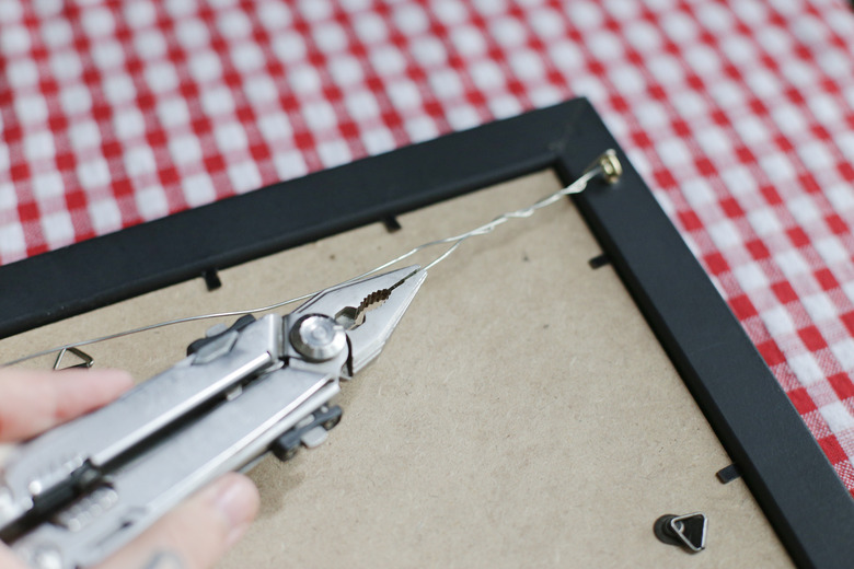 Secure the picture frame wire to one of the 2-hole triangle d-rings. Bend and loop the end of the wire back over the d-ring to create a small knot. Use needle-nose pliers to twist the end around the wire several times.