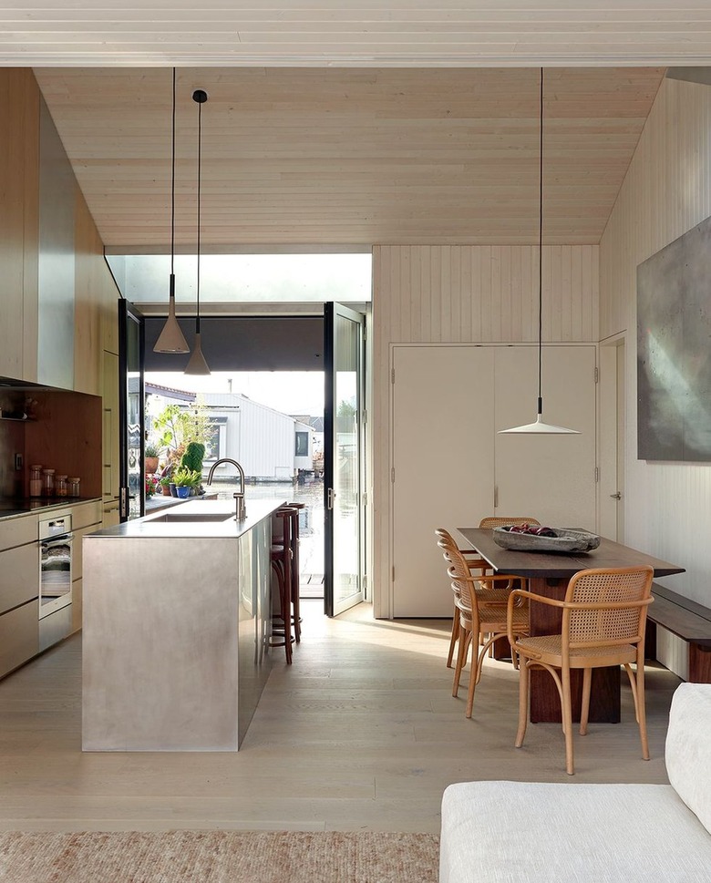 The warm neutral tones in this kitchen by the team from Studio Diaa evoke calming feelings, making for a welcoming space that you'll enjoy waking up to every day. The varied tones in the pewter-colored island add dimension to the monochromatic beige palette and act as a focal point for the kitchen.
