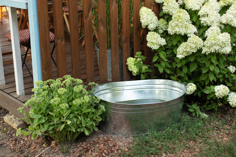 Another way to make galvanized metal look old is to distress it by hitting it with hammers or mallets, pounding on it with a large rock, or just banging around the piece a bit. The distressed look paired with the vinegar or saltwater treatment makes the metal piece look like it's well used and quite old.