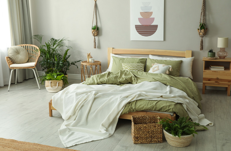 If the bedroom windows look out over some beautiful scenery, such as woods, mountains, or a body of water with no neighboring house windows nearby, position the bed for the maximum view in a way that still makes sense for the space. For instance, center the bed's headboard on the wall opposite some large windows with a great private view; this way, you're free to sit up in bed and take in the surroundings. If that's not an option, a wall adjacent to the windows may work, as you'll still be able to see outside and enjoy the view. Windows that face east may be the exception to this choice unless you enjoy waking up at sunrise or you install some seriously light-blocking blackout curtains.