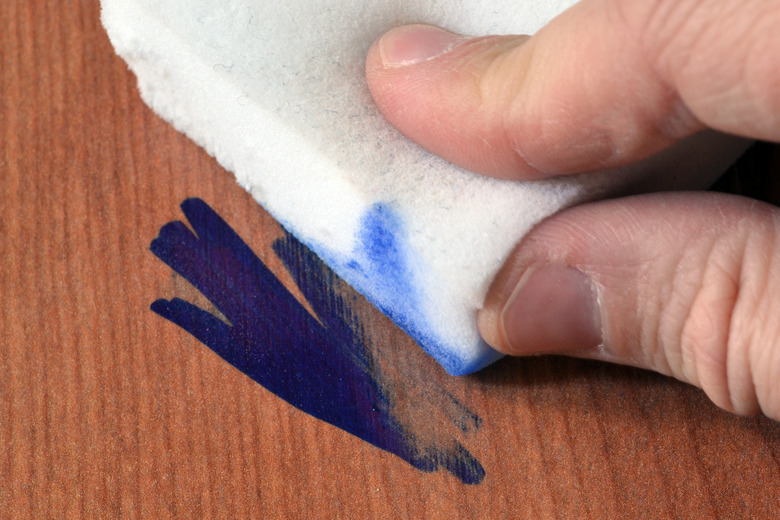 A melamine foam eraser — the spongy material designed to remove scuffs, marks and grease from many household surfaces — may remove the ink from the laminate as well, especially if the ink is fairly fresh. Wet a corner of the foam eraser; then rub it gently over the ink, working from one end of the ink mark to the other. Rub gently at first, applying more pressure only if needed. Rubbing too vigorously may damage the look of the laminate.