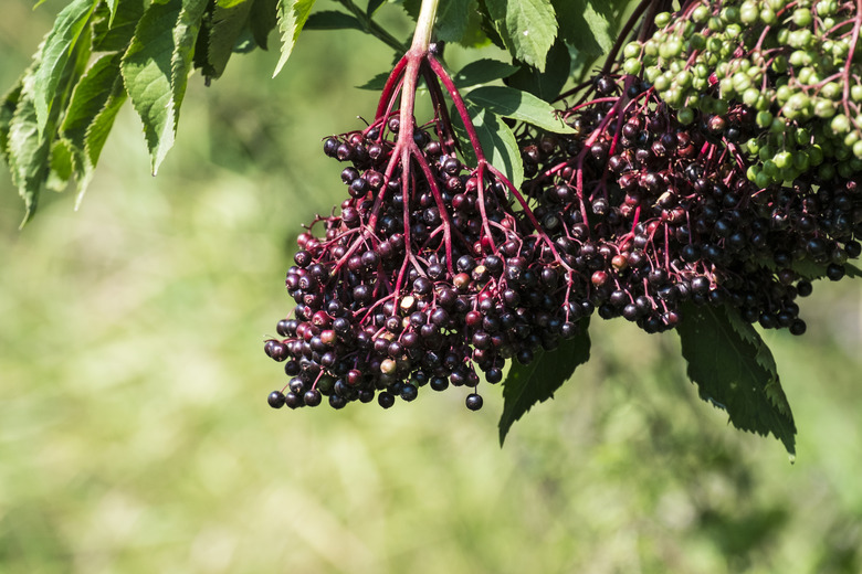 Elderberries ripen from late August through early September. Pick entire clusters of berries, and strip the berries from the stems. Place the berries in hot water, and let them simmer for 15 minutes to cook them. Use the cooked berries in pies, or place the cooked berries in a cheesecloth berry bag and squeeze out the juice.