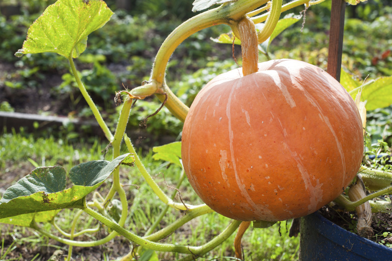 For example, you might apply a 5-10-10 fertilizer to the soil about six to eight inches around pumpkin seedlings. As the pumpkin grows, switch to a 20-20-20, or even manure alone. While the plants are mature and expanding, use a fertilizer with more potassium such as a 10-10-20. A super-potassium fertilizer, a 0-0-60, is available for giant-pumpkin growers. The amount of fertilizer will depend on the size of the garden, not the size of the pumpkin. The amount will also vary based on the type of fertilizer used, with more for phosphates but less for nitrogen-intensive fertilizer. Fertilizer packages will usually have recommendations according to the square-foot size of the garden, or in this case, the pumpkin patch.