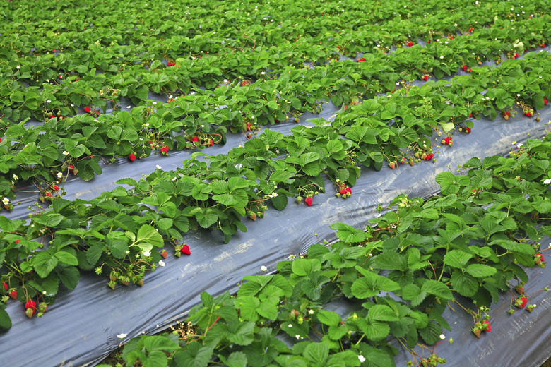Fertilize your strawberry plants with a 15-5-10 fertilizer at planting time, mixing about 2 cups of the selected fertilizer into the soil of each 25-foot row of berry plants. Switch to a 21-0-0 nitrogen fertilizer for application every three weeks during the growing season, applying about 3/4 cup of the fertilizer per row.