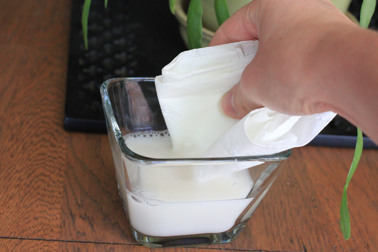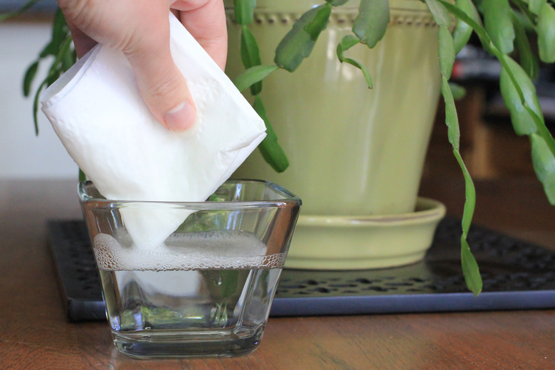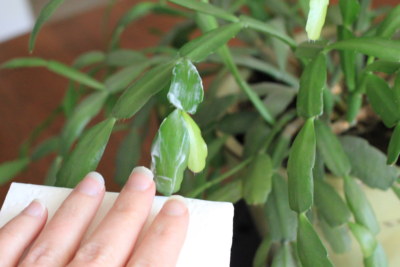 Make a wash with a mild soap mixed in water. Dampen a cloth or tissue in soap water, and clean the plants. Make sure you are only wiping the leaves gently and not scrubbing them.