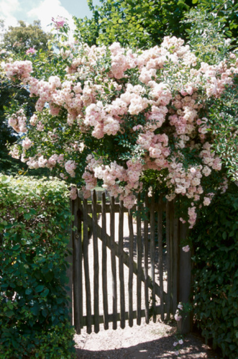 Roses are safe for dogs. Climbing rose choices in size and color are wide and varied. Jeanne laJoie is a climbing pink miniature rose growing to 10-feet long. Plant this small-flowered mini alongside the large-flowered pink blend Eden for a summer flowering display in pink and cream. Zepherine Droughin is nearly thornless, blooming heavily with deep pink roses in spring on a plant growing to 12-feet high. Peggy Martin is an easy-to-grow spring bloomer in light pink. Choose climbing roses for trellises according to color preference, growth habit and local growing conditions.