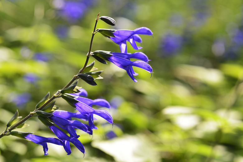 Black and Blue salvia (Salvia guaranitica "Black and Blue") is an anise-scented sage cultivar which may grow up to 6 feet tall in ideal growing conditions, producing 15-inch spikes of deep blue, two-lipped flowers from mid-summer into fall. Effective as a border, bedding or container plant, Black and Blue salvia offers the added benefit of attracting hummingbirds and butterflies to the garden. The low-maintenance perennial requires little care to thrive.