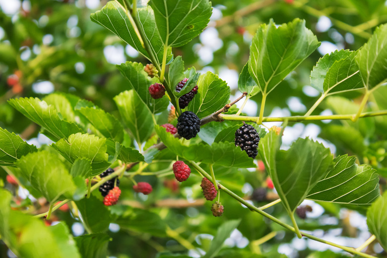 Although the trees themselves may not be dependably male or female, every mulberry flower does have a gender that you can determine for a particular moment in time, even if that gender may change at some point in the future. Tiny mulberry blossoms grow in drooping clusters called catkins. Each of the three species of mulberry has flowers that present slightly differently. The flowers of black mulberry (Morus nigra) are small spiky catkins, green in color. Those of the red mulberry (Morus rubra) are pale green catkins, while those of white mulberry (Morus alba) are small green spikes.
