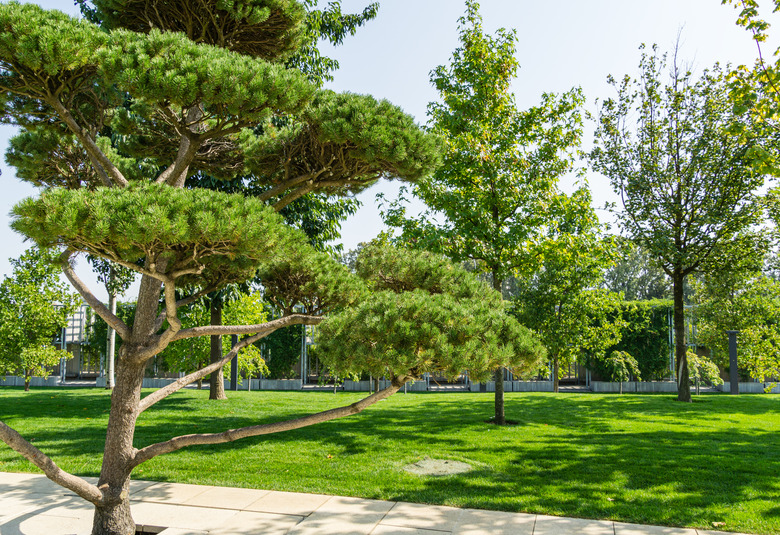 There are several cultivars of mugo pines, including Gnome. This is the smallest type, and it only grows up to 1.5 feet and out to 3 feet. Enci is a flat-topped mugo pine that can become very round and dense; it grows up to 3 feet. Little mugo pine (Pinus mugo var. pumilio) is taller than the Gnome and Enci cultivars, but it's a shorter variety of the species plant, growing 4 to 6 feet tall with a slightly wider spread.