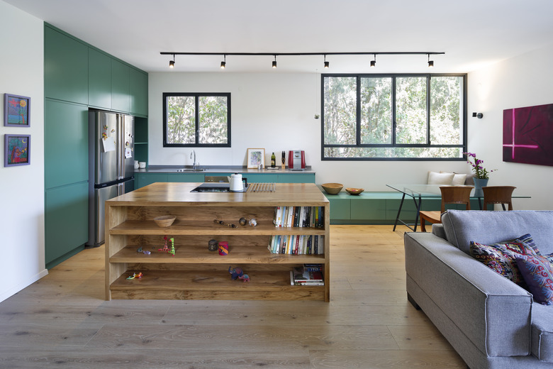 For a young woman living in Haifa, Israel, there was no time like the present to renovate her apartment. Her entire building was set for construction to strengthen its structure and expand its properties, but the timeline for doing so was up in the air. Rather than wait, she and architect Tal Losica came up with two plans: one for the current apartment and another for the enlarged space. "The design had to be efficient and suitable for both scenarios," Losica said. The architect devised an open plan that stretches the length of the address — including the kitchen, living, and dining area — all the way to the office. The building is surrounded by trees, with a forest to the north and an intimate garden to the south, so Losica chose to then outfit the bright layout with a verdant color palette and natural materials to connect the home with its surroundings. For instance, the kitchen cabinetry and built-in bench in the dining area are painted a bright green, contrasting with the oak island and wood flooring. The private spaces, meanwhile, are enclosed and decorated in crisp, calm whites. The earthy, airy results are the best of both worlds: the owner can enjoy the change now, and await for possible changes later.