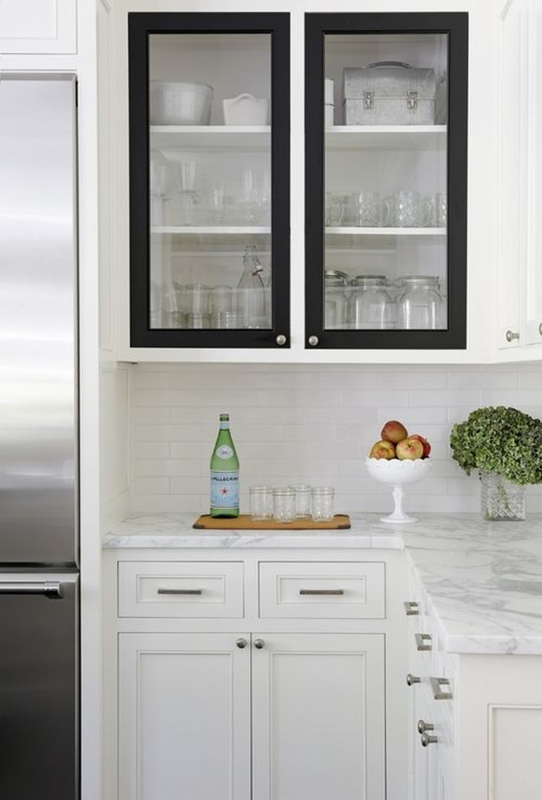 An all-white kitchen is modern and timeless, but it can come across as bland if you don't incorporate any differentiating design elements. This kitchen stands out from the pack by adding a simple black border around two cabinet doors. Think of it like a picture frame and use it to display your best dishes for a kitchen that is always on trend. Plus, it's easy to change if you get sick of it down the road.