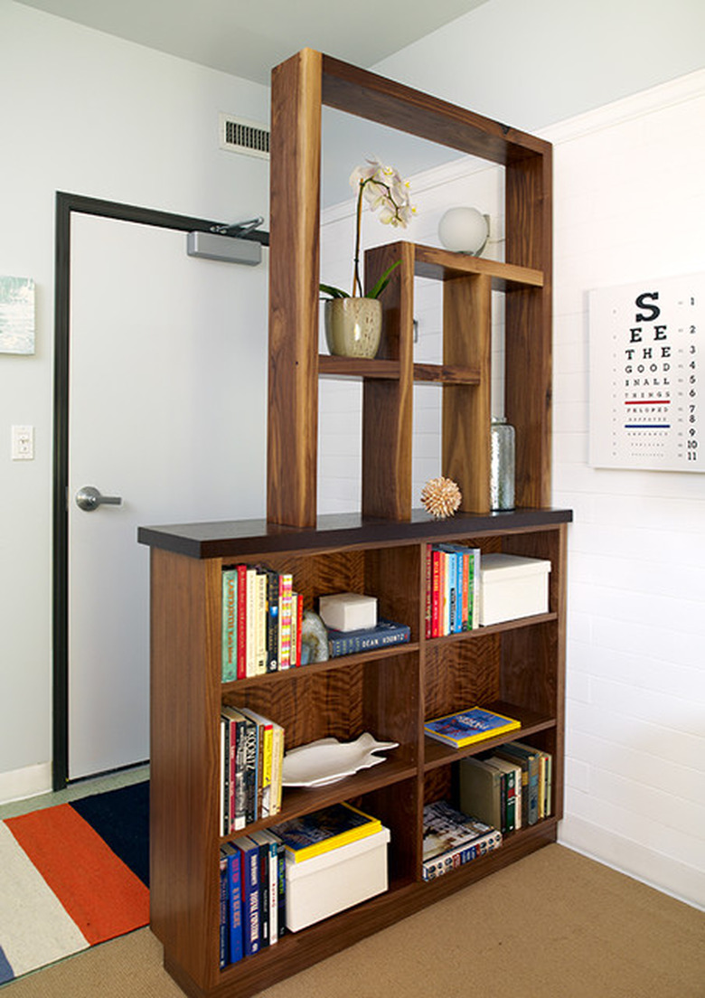 Section off an area for your entryway directly in front of the door by using a simple bookcase. Add decorative open shelving to the top, like in this space by EMI Interior Design, to create a natural transition between the new foyer and the existing living room. The added storage is definitely a perk, too.