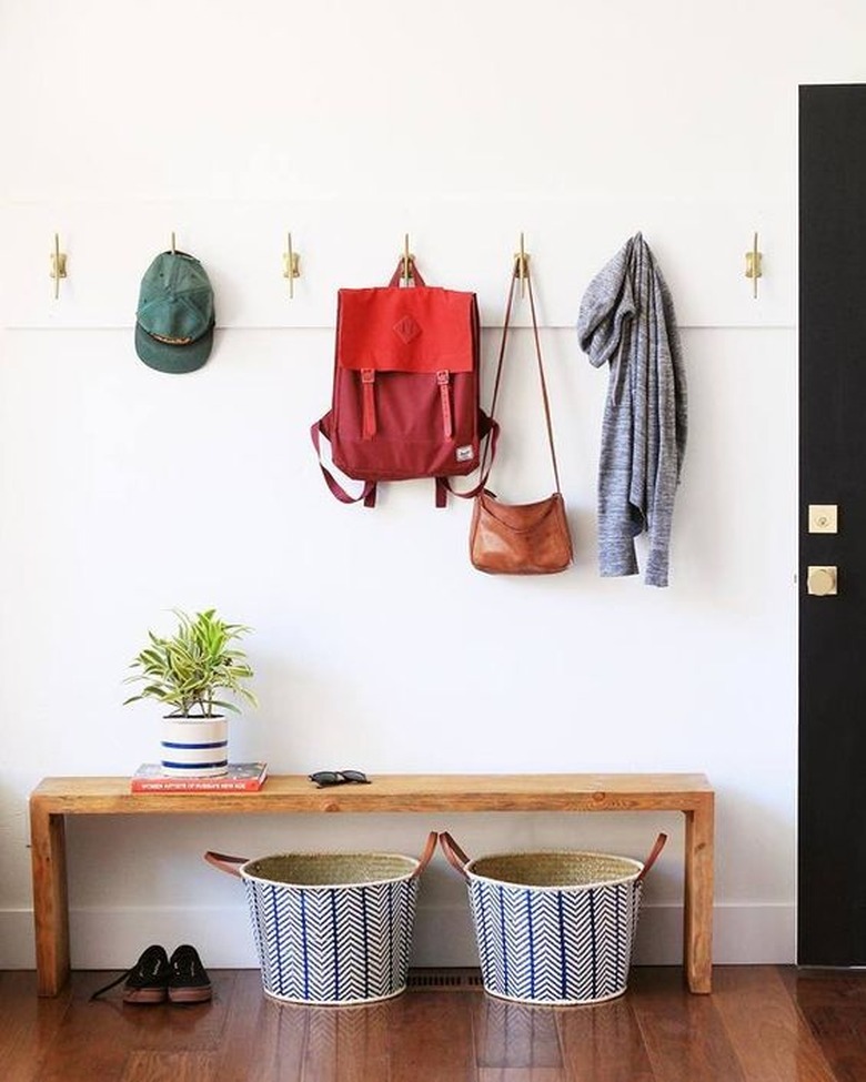 Install a row of uniform hooks along the same wall as the front door, as seen in this entryway from interior designer Jenny Komenda, to store frequently-used bags and jackets that you can easily grab on your way out. Add a narrow bench for a place to sit, and a set of matching fabric baskets to help keep everything neat and tidy.