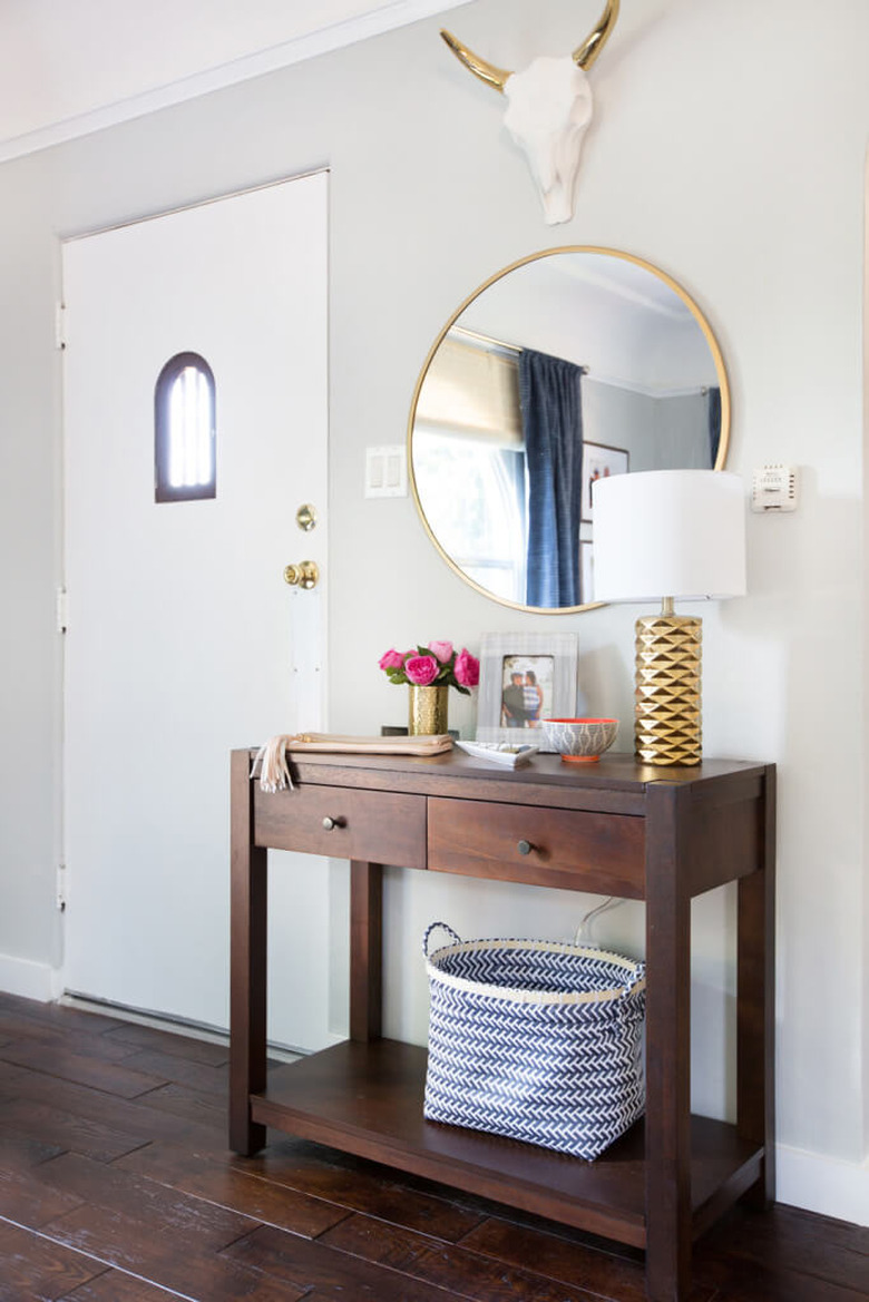 If you have a large blank wall near your front door, use a portion of it to create a small entryway complete with a console table, mirror, and small bench. This modern southwest space spotted on LX Crafts Co. uses a large potted plant on either side of a table to make the space feel purposeful and complete.