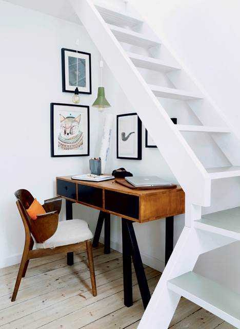 This modern home featured in the Danish publication ALT utilizes the overlooked nook under the stairs as an inviting work space. Since the desk is visible from the main living area, you'll want to keep things tidy — look for something with a drawer that you can use to store away papers when you're done for the day.