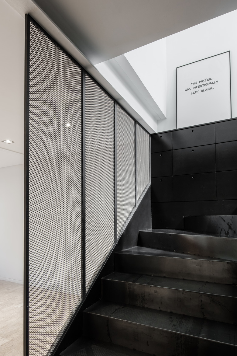 Steel steps enclosed by metal mesh panels contrast against pre-existing steel beams painted white. A custom shoe cabinet inspired by old post office cabinets rests at the top of the stairs.