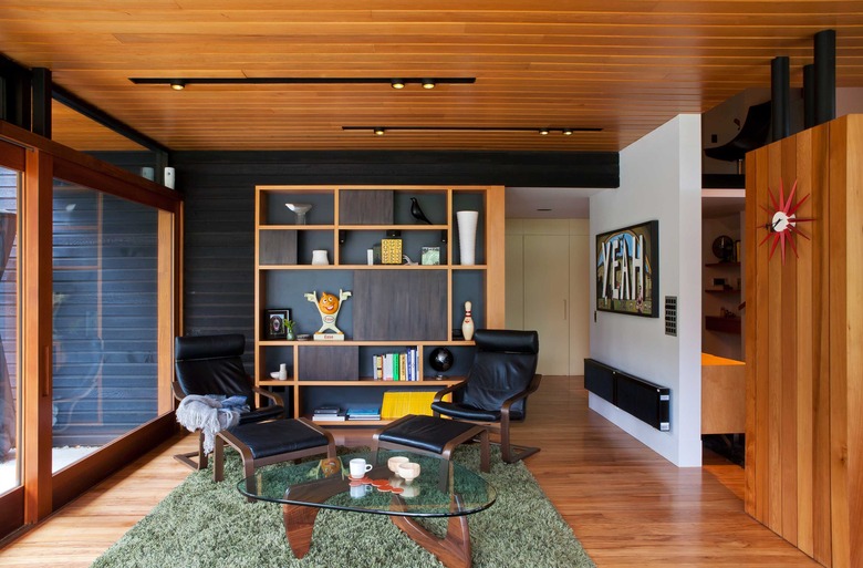 Dorrington used timber for the walls, floors, and ceilings in the living pavilion to create warmth. Meanwhile, the black-stained cedar weatherboards continue from the exterior, adding contrast. The owner's Noguchi table, shag rug, and George Nelson Sunburst Clock highlight the midcentury vibe.