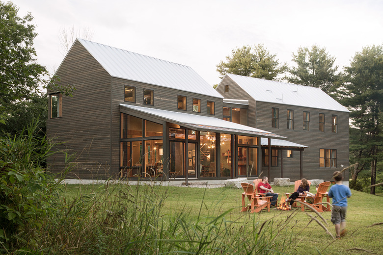 The house's shape evokes a classic barn, while expansive Marvin windows bring in plenty of light. The exterior is clad in custom siding stained in Benjamin Moore's "Dragon's Breath."