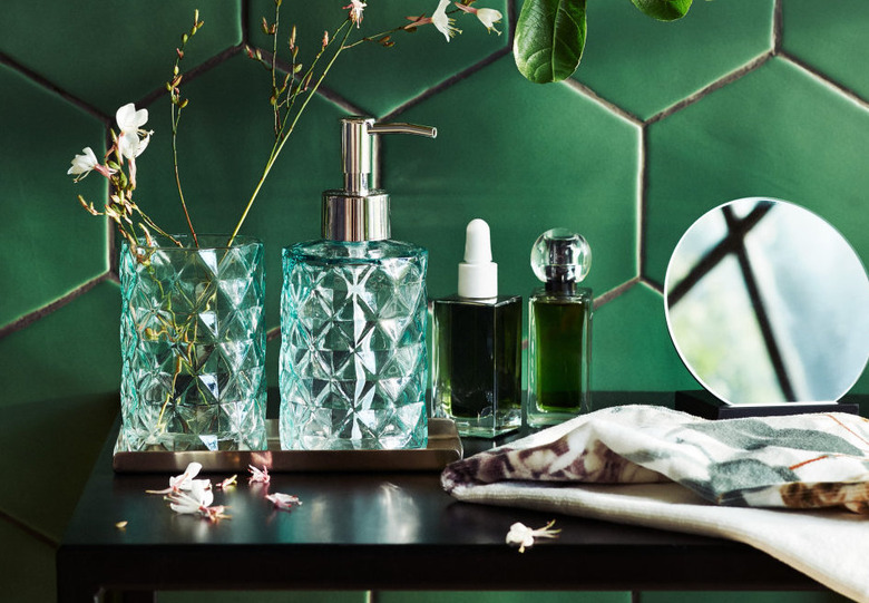 If you're doing a bathroom makeover, one thing to consider is storage. Go for glass containers that allow you to see their contents.