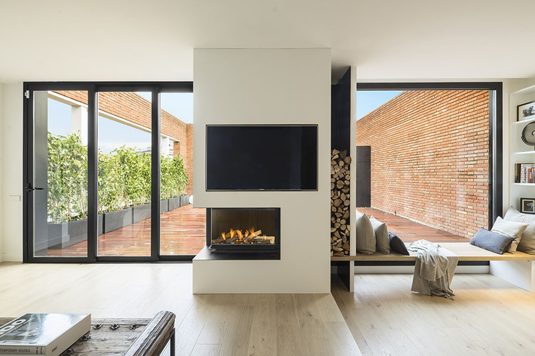 A built-in fireplace by Hergom made out of black steel sets the tone for the rest of the apartment. It's one way that the architect utilized asymmetrical elements to create a cohesive symmetry. The black steel material is repeated in the bordered windows and throughout the kitchen.