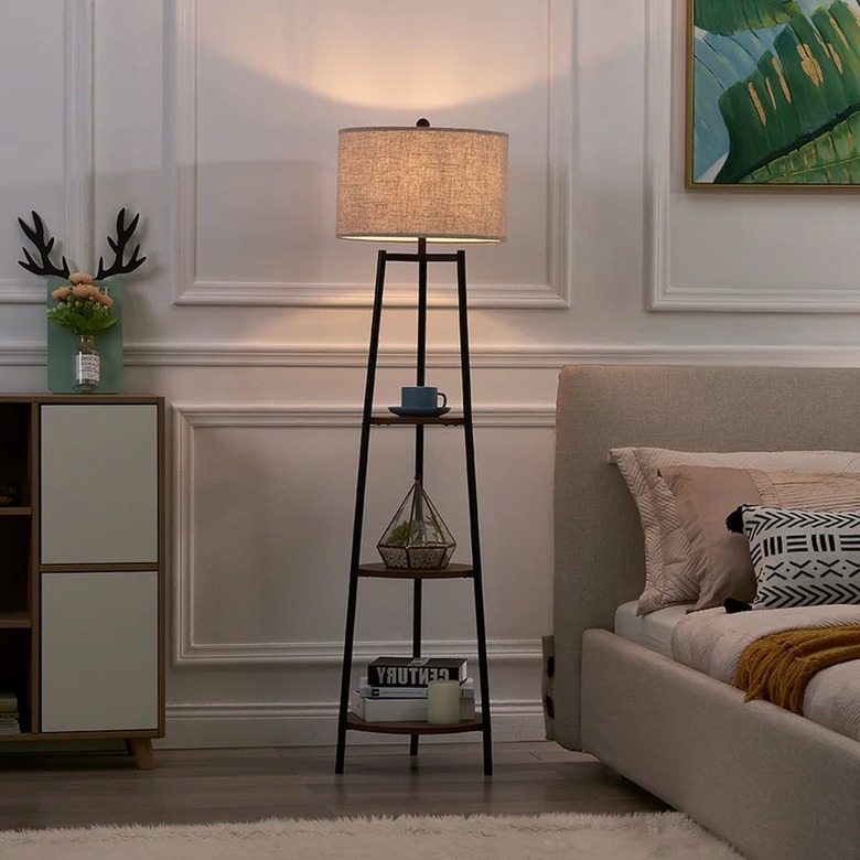 Ditch a standard table lamp and consider this three-shelf floor lamp from Wayfair, which comes in three finishes: black and walnut, brushed nickel, and gold and white.